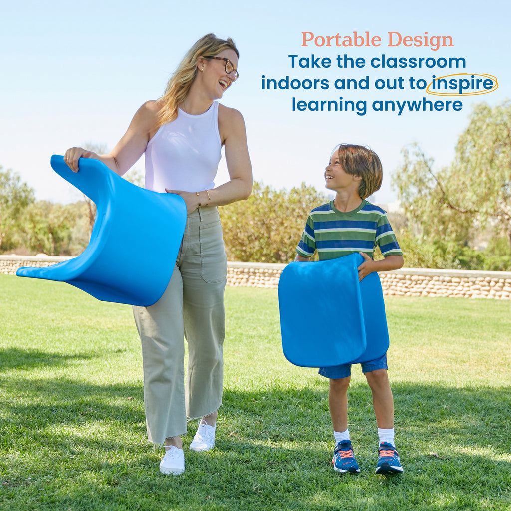 The Wave Seat is a fun multi-positional chair to rock, perch or sit. This two-pack of stools grows with you for use with young children to adults. The active core engagement stool evolves from an assisted rocker for little ones, to a saddle-style seat with wobble base, to a perch seat, and full seating surface. The forward seat angle keeps legs engaged for active seating that supports upright posture and alertness. These chairs are intentionally designed for shorter periods of sitting, perfect for high-traffic spaces like libraries, common areas, outdoor classrooms, and places for quick conversations. Designed for everyday use in schools, homes or offices, these lightweight stools let you quickly rearrange workspaces. Easily circle up for discussions or pair with activity tables and desks for individual and collaborative work. Creative classroom seating supports different learning styles and empowers both students and teachers. These flexible seats provide freedom to move making it the perfect grab-and-go stool for taking the classroom indoors and out. When learning time is over, two seats nest together for compact storage to save valuable floor space. The streamlined one-piece plastic design features rounded edges and no hard corners for safety, comes fully assembled and is maintenance-free.