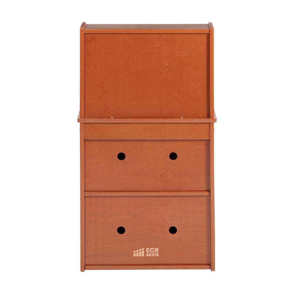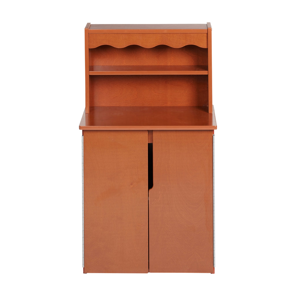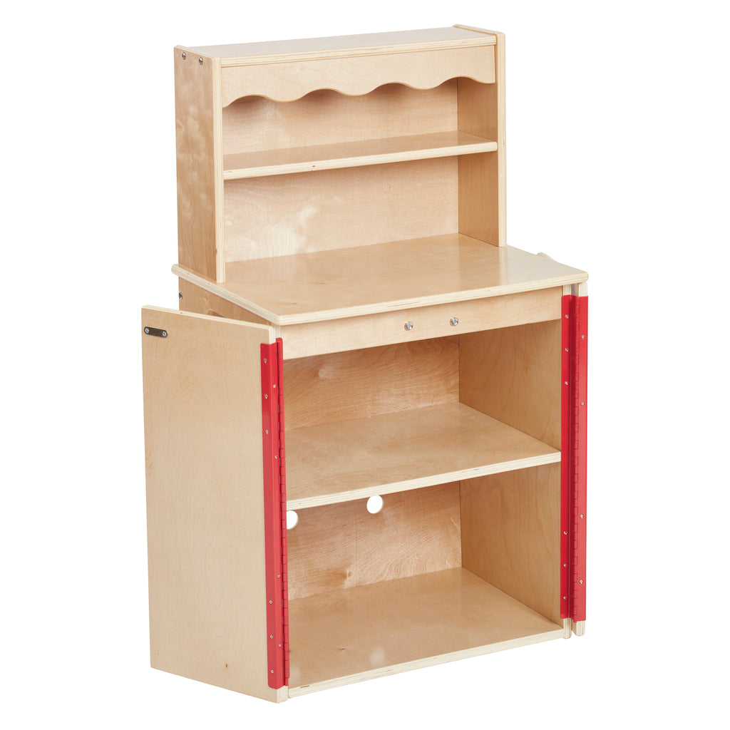The ECR4Kids play kitchen pantry with a display shelf is designed to encourage aspiring chefs to express their creativity and explore new ways to play. Kitchen sets for kids encourage social interaction which is crucial for cognitive and emotional growth, supporting language and empathy through interactive play. Toddlers practice sharing, problem-solving among peers, and communicating ideas. The kid’s kitchen playset contains realistic features including open shelves to style and personalize their kitchen. The countertop offers extra space to practice real-life skills like chopping, mixing, and plating meals in fun ways. Internal shelves provide ample space to store toy foods, dishes, pots and pans, and kitchen accessories; encouraging children to keep their space clean and organized. Choosing specific spots for personal items helps build confidence and decision-making. Designed to withstand endless hours of play in a daycare, preschool, or home. The sturdy wooden kitchen features rounded edges, and full-length piano hinges to protect little fingers from getting pinched and allows the doors to open completely and lay flat against the unit. Handle cutouts create an easier opening for small hands and magnetic closures keep doors safely closed. Pair with ECR4Kids refrigerator, stove, and sink to complete the set; sold separately.