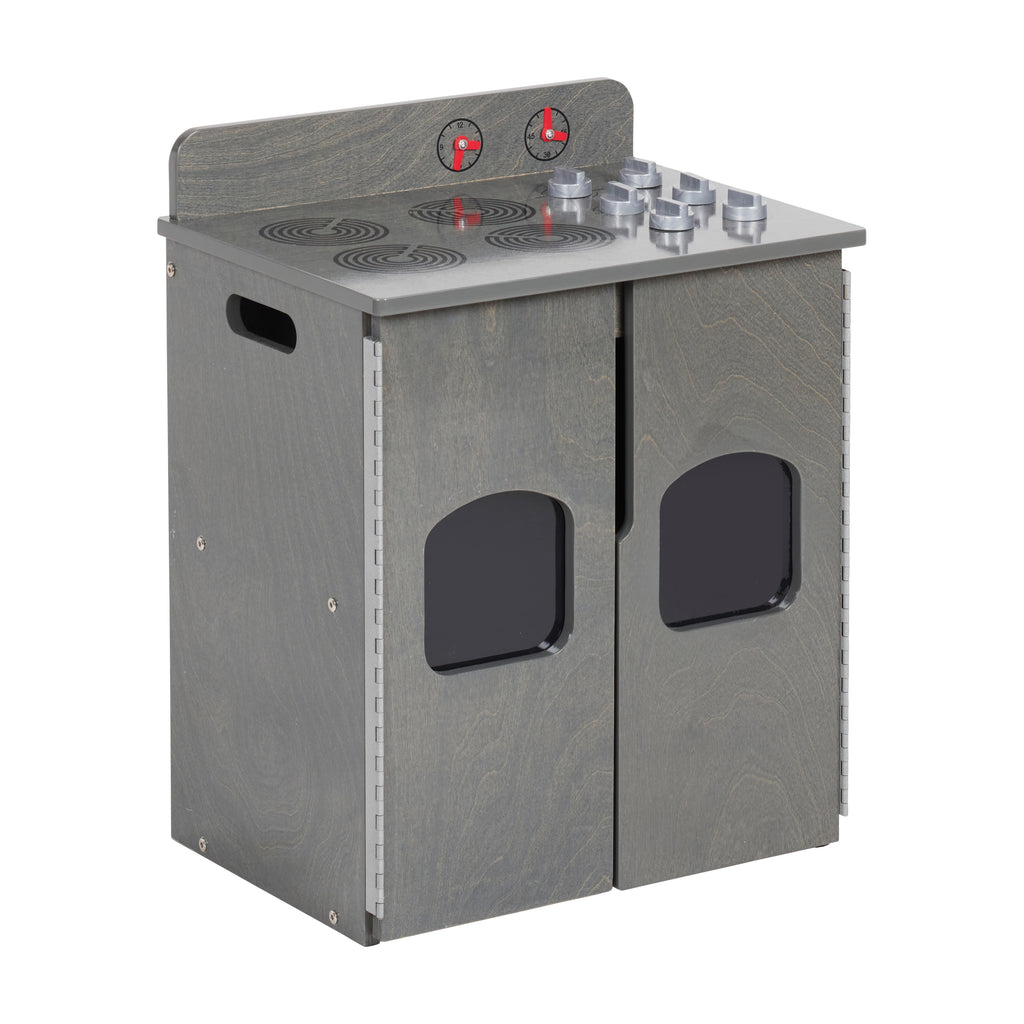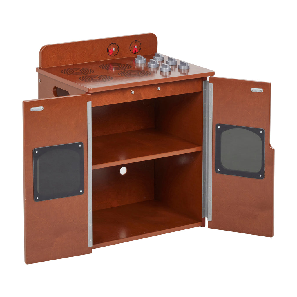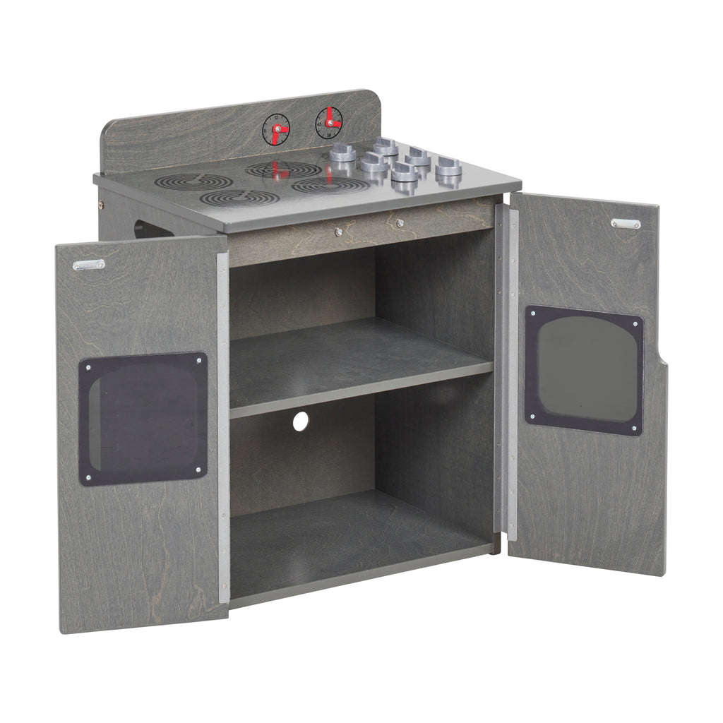 The ECR4Kids play kitchen stove is designed to encourage aspiring chefs to express their creativity and explore new ways to play. Kitchen sets for kids encourage social interaction which is crucial for cognitive and emotional growth, supporting language and empathy through interactive play. Toddlers practice sharing, problem-solving among peers, and communicating ideas. The kitchen playset contains realistic features including four stove top burners, six chrome-looking knobs that "click" when turned, two pretend clocks to set the time in minutes or seconds, and a peek-a-boo window. Little ones will love to check on their meals. Internal shelves are ideal for baking cookies and provide ample space to store toy foods, dishes, and kitchen accessories; encouraging children to keep their space clean and organized. Designed to withstand endless hours of play in a daycare, preschool, or home. The sturdy wooden kitchen features rounded edges, and full-length piano hinges to protect little fingers from getting pinched and allows the doors to open completely and lay flat against the unit. Handle cutouts create an easier opening for small hands and magnetic closures keep doors safely closed. Pair with ECR4Kids sink, refrigerator, and cupboard to complete the set; sold separately.