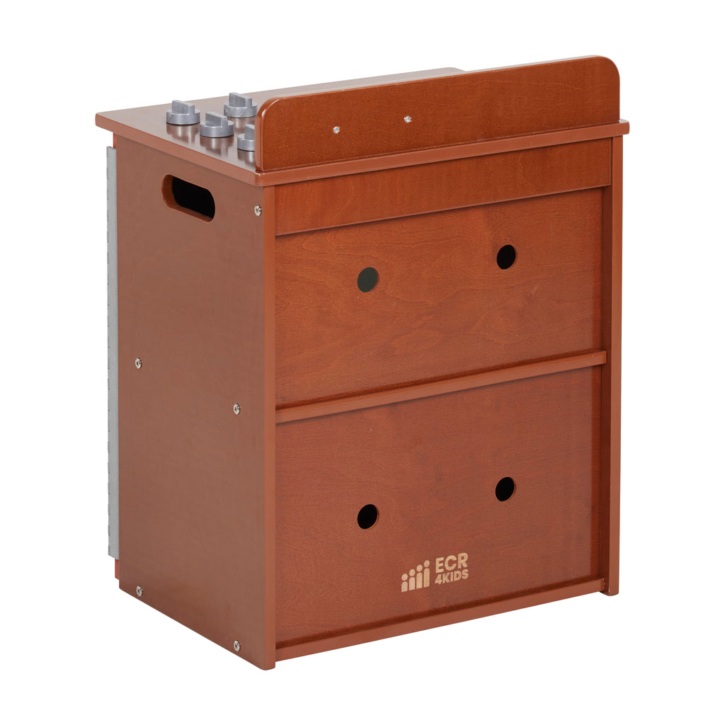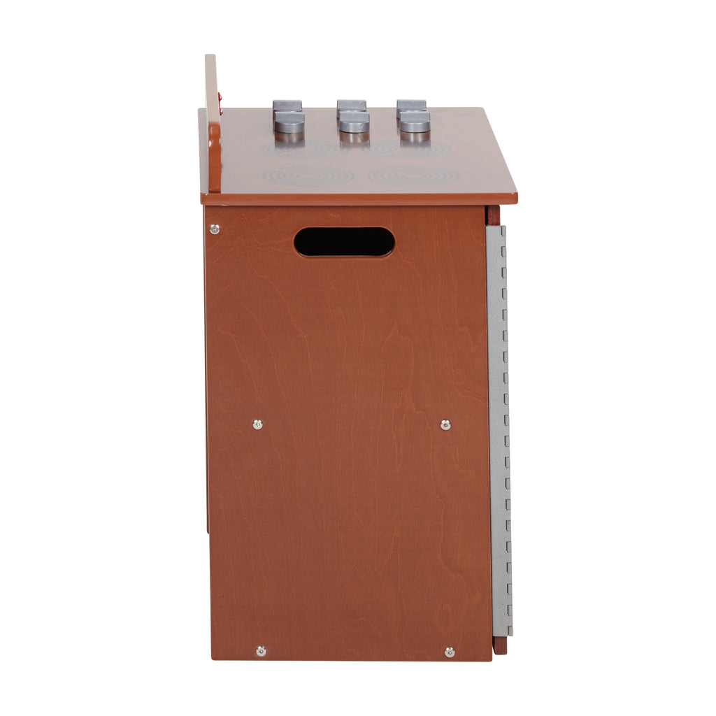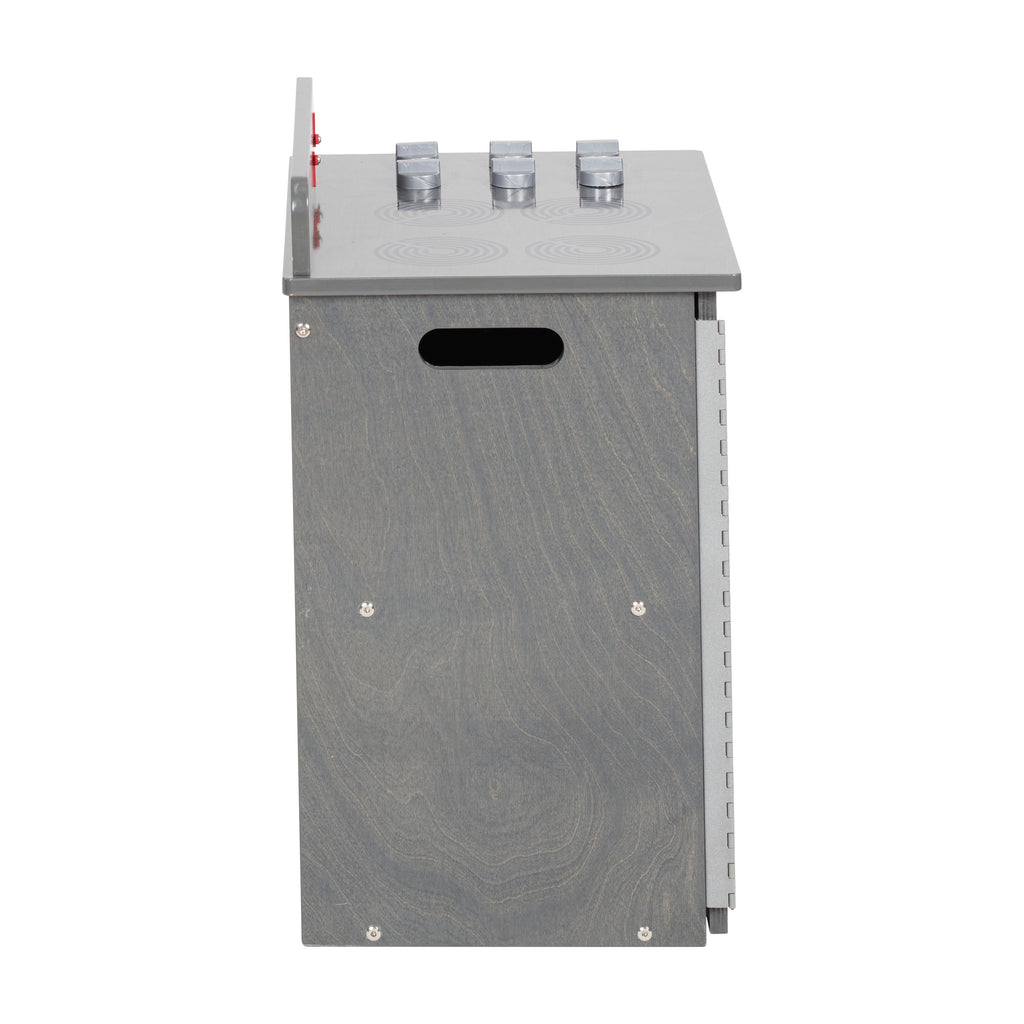 The ECR4Kids play kitchen stove is designed to encourage aspiring chefs to express their creativity and explore new ways to play. Kitchen sets for kids encourage social interaction which is crucial for cognitive and emotional growth, supporting language and empathy through interactive play. Toddlers practice sharing, problem-solving among peers, and communicating ideas. The kitchen playset contains realistic features including four stove top burners, six chrome-looking knobs that "click" when turned, two pretend clocks to set the time in minutes or seconds, and a peek-a-boo window. Little ones will love to check on their meals. Internal shelves are ideal for baking cookies and provide ample space to store toy foods, dishes, and kitchen accessories; encouraging children to keep their space clean and organized. Designed to withstand endless hours of play in a daycare, preschool, or home. The sturdy wooden kitchen features rounded edges, and full-length piano hinges to protect little fingers from getting pinched and allows the doors to open completely and lay flat against the unit. Handle cutouts create an easier opening for small hands and magnetic closures keep doors safely closed. Pair with ECR4Kids sink, refrigerator, and cupboard to complete the set; sold separately.