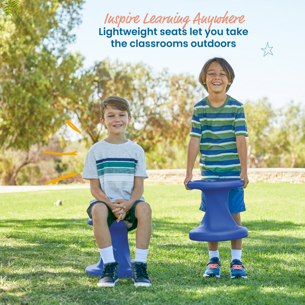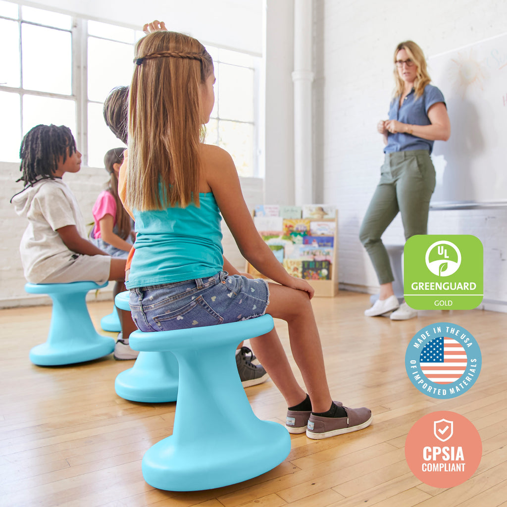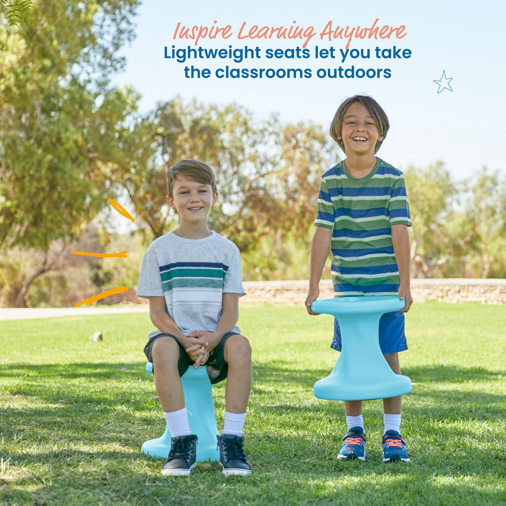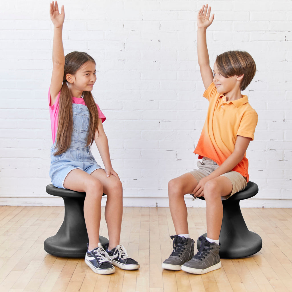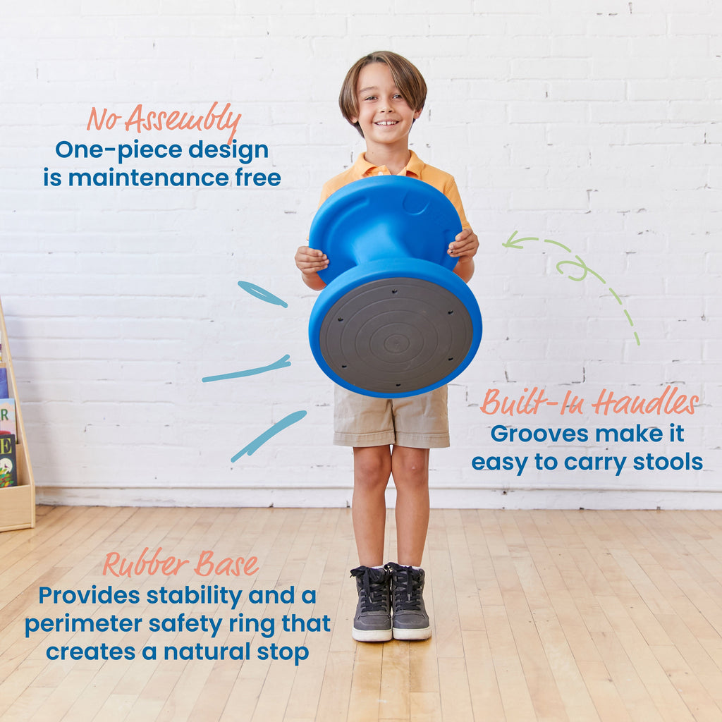 The Twist Stool is a fun flexible seating option that allows users to move and sway while they work. Seats that rock, tilt, and swivel encourage good posture and alertness, and the rounded convex base allows for freedom of movement. Designed for everyday use in schools, homes or offices, these functional and colorful stools are a fun way to provide extra seating in any learning space. Seats make it easy for students to circle up for discussions or pair with activity tables for individual and collaborative work. Wobble seats helps sustain attention and focus by creating an outlet for fidgeting. Continuous small movements increase blood flow to the body and brain aiding concentration without distracting others nearby. Active seating is ideal for individuals who have restlessness, ADHD, ASD, or sensory sensitivities. The lightweight and adaptable seat is the perfect grab-and-go stool for taking the classroom indoors and out. Quickly and easily rearrange workspaces to create a dynamic collaborative environment between students or use for individual work study. This wobble stool features a latex-free rubberized base that helps keep the seat in place on hard or carpeted surfaces, and a perimeter safety ring that creates a natural stop.