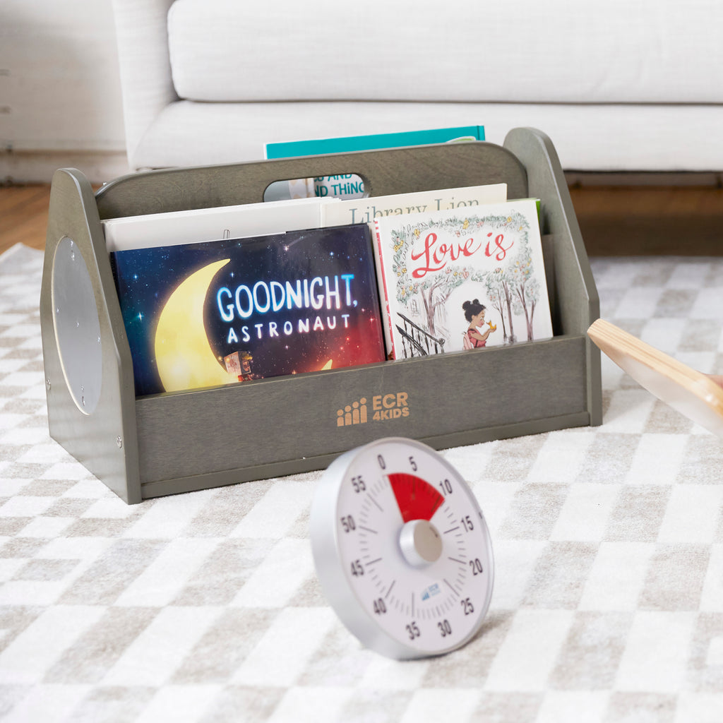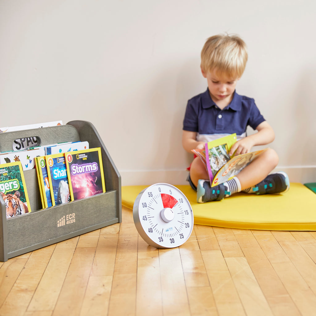 Cultivate a love for reading with the ECR4Kids Double-Sided Book Rack with Countdown Timer. A children’s book display is a great way to introduce literacy at a young age in daycares, preschools, kindergarten, and at home. Designed to grow with little ones, this classroom bookshelf helps parents, teachers, and educators provide exposure to different books while staying organized. The slanted double-sided storage provides easy access to forward-facing books, encourages children to select their favorite story independently, introduce organizational skills, and clean up when playtime is over. The library storage features a cutout handle with rounded edges for quick transportation between classrooms and educational spaces. The countdown clock winds up with three alarm sounds designed for classroom management: mute, quiet, and loud. The timer introduces visual time to kids with a stand to display on a coffee table, the floor, or attached to a magnetic whiteboard. Constructed from sustainably harvested birch plywood with a durable finish sealing the wood surface and resisting scratching. A UV inhibitor helps furniture resist ultraviolet light and yellowing. Birch plywood is extremely durable and will hold up to everyday use in early childhood environments.